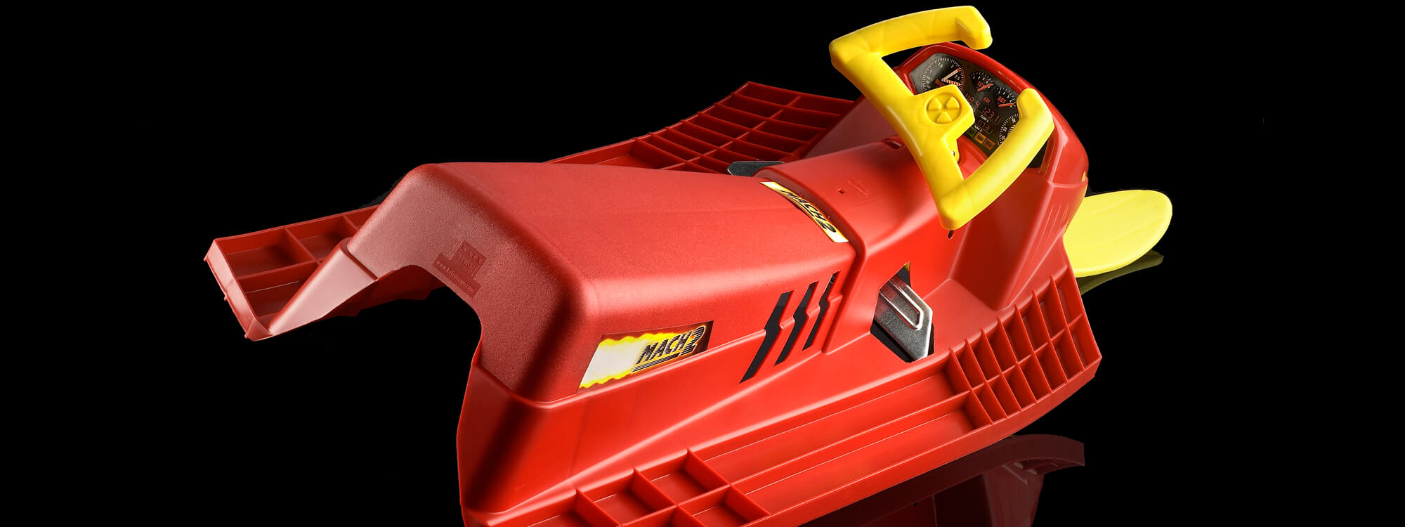 Speed and control equal fun. A simple formula used in the Mach 2 Sled. A positive steering ski coupled with moulded in runners on the main skis deliver performance. High density polyethylene helps deliver a low friction coefficient as well as durability in cold temperatures. As opposed to bent metal tubing structure which was the norm in this category, single part injection moulded cut cost by over 50% with a higher percievd value.